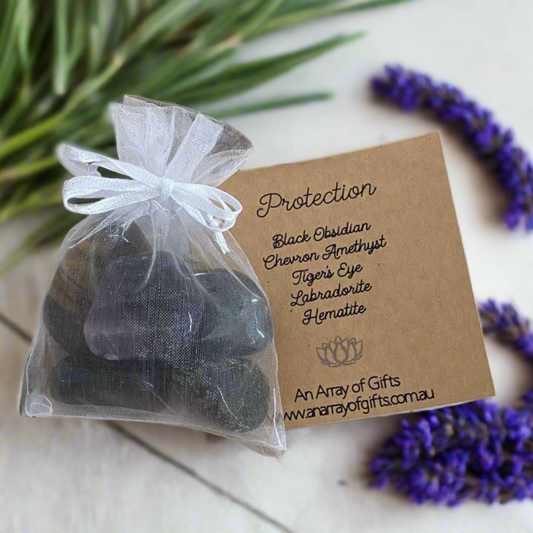 Protection Tumbled Stone Kit | Chevron Amethyst, Tiger's Eye, Black Obsidian, Labradorite, Hematite | Spiritual Shield for Grounding & Energy Protection