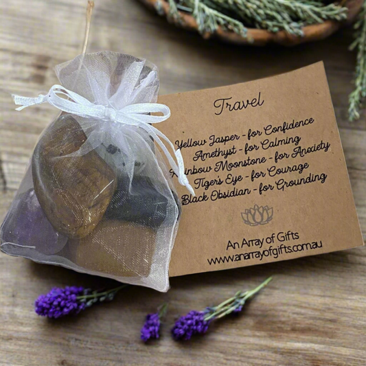 Travel Tumbled Stone Kit | Black Obsidian, Amethyst, Tiger's Eye, Rainbow Moonstone, Yellow Jasper | Grounding, Calm & Confidence on Your Journey