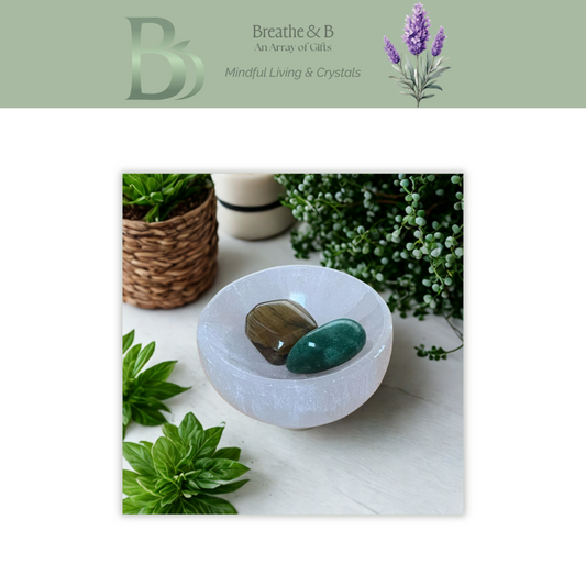 Mindful Calm Crystal Set – Selenite Bowl, Tiger’s Eye and Green Aventurine | Balance, Focus & Inner Peace